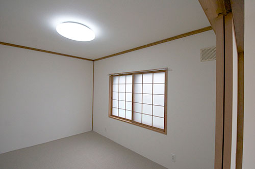 今回は募集前の内装工事で、壁紙や床の張り替えだけに留まらず、台所・換気扇までも一式交換しました。そして、シャンプードレッサーも新品ですし、照明も新品。灯油ストーブや靴箱までもが新品です。